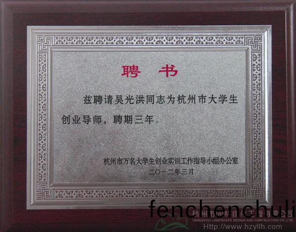 ?近日,杭(hang)州(zhou)市(shi)萬(wan)名(ming)大(da)學(xue)生創(chuang)業實(shi)訓工作指導(dao)小(xiao)組辦(ban)公(gong)室下髮通知(zhi),公(gong)佈(bu)了杭州(zhou)市(shi)第(di)三批(pi)大(da)學(xue)生(sheng)創(chuang)業(ye)導(dao)師名(ming)單(dan),其(qi)中,杭(hang)州市(shi)園(yuan)林綠(lv)化工(gong)程(cheng)有限(xian)公司(si)董事長吳光洪爲(wei)授聘的(de)導師之(zhi)一。