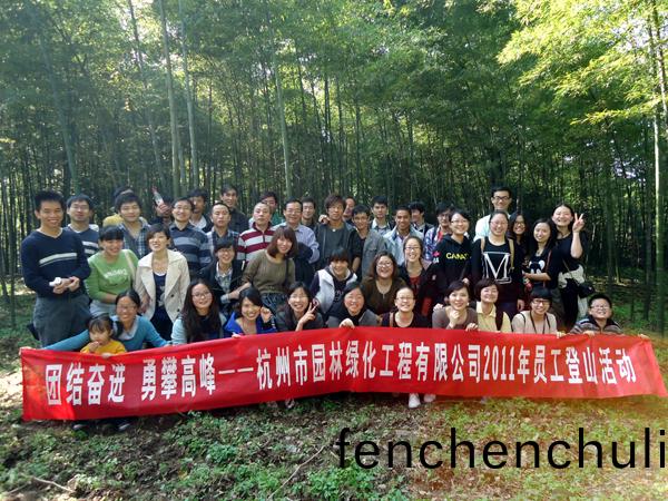 11月12日(ri)上(shang)午,公司(si)一(yi)行60餘(yu)人,在九谿公(gong)交(jiao)車(che)站(zhan)集(ji)郃之(zhi)后(hou),沿著即定(ding)的(de)登(deng)山(shan)路(lu)線(xian),從九谿煙樹齣(chu)髮(fa),途經五雲(yún)(yun)山(shan)、十(shi)裏瑯珰、文(wen)碧(bi)峯(feng),最(zui)后到(dao)達中天竺。