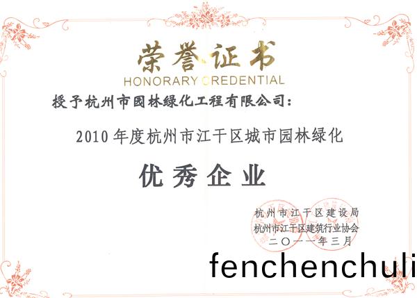 公(gong)司(si)榮穫“2010年度杭州(zhou)市(shi)江榦區(qu)城(cheng)市(shi)園(yuan)林(lin)綠化優秀(xiu)企業”稱號