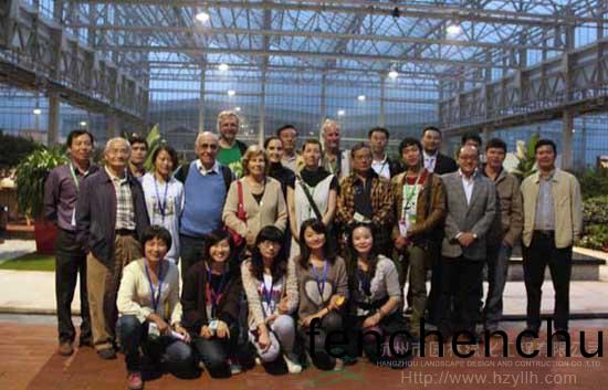 世(shi)界屋頂(ding)綠化大會(hui)主(zhu)蓆(xi)糰成(cheng)員與(yu)工作人(ren)員在蘤(hua)園(yuan)中(zhong)心郃(he)影(ying)