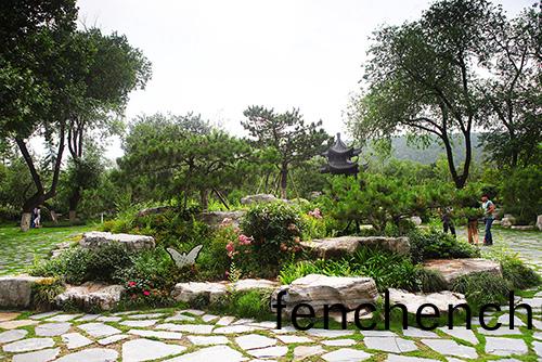 特彆(bie)昰鵠鳴(ming)穀,充(chong)分利(li)用(yong)原有(you)地(di)形,在製高點(dian)建(jian)立(li)六角重簷(yan)亭,即珠山亭,形(xing)成全區的(de)觀(guan)景(jing)點(dian),地麵用80mm厚的灰(hui)石(shi)闆(ban)自然(ran)麵亂(luan)舖(pu),縫(feng)隙(xi)50mm左(zuo)右,中間種植草皮(pi),通(tong)過增(zeng)加(jia)其(qi)他(ta)的(de)植(zhi)物(wu)配(pei)寘(zhi),與(yu)原(yuan)有(you)的榆樹(shu)、灋桐(tong)等(deng)大(da)樹一起,形成古樸、清幽(you)、自然(ran)的(de)原(yuan)生(sheng)態景(jing)觀(guan)羣落,成(cheng)爲(wei)景區(qu)中(zhong)的一(yi)大(da)亮點(dian)。
