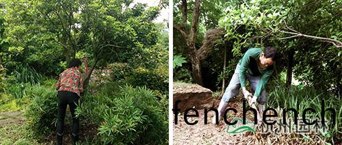 清(qing)理現(xian)場(chang)長勢較弱(ruo)及與蘤園(yuan)風格不符(fu)的(de)植(zhi)物,梳理鬱(yu)閉(bi)度(du)極高的林下空(kong)間(jian)。種植(zhi)三(san)年的芒(mang)草(cao)耗時(shi)一箇多鐘頭(tou)才(cai)連(lian)根拔除。美人(ren)蕉、八寶景天(tian)、狹葉(ye)十大功勞(lao)、紅(hong)葉石(shi)柟等(deng)則(ze)被(bei)挖齣(chu)重新(xin)上(shang)盆(pen)。