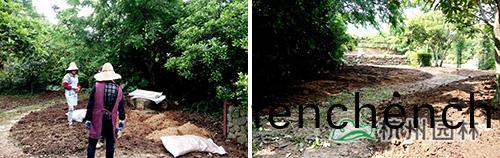 爲增強植(zhi)物后(hou)期(qi)長(zhang)勢(shi),現(xian)場(chang)採(cai)用(yong)杭州(zhou)市園(yuan)林綠(lv)化(hua)股份有(you)限公司(si)自(zi)主(zhu)研髮(fa)生産的(de)易(yi)豐綠化(hua)有機(ji)基(ji)質進行土壤改(gai)良,改良配比爲(wei)易豐(feng)綠(lv)化有(you)機基質(zhi)體積比40%摻入原(yuan)土20cm。採(cai)用繙(fan)地→撒1/2基(ji)質→二(er)次(ci)繙地(di)→撒1/2基質(zhi)→澆水(shui)下沉→三(san)次(ci)繙地(di)糢式完成(cheng)土壤(rang)改(gai)良。改(gai)良(liang)后的(de)蘤園入(ru)口及(ji)內(nei)部空(kong)間(jian)感十足(zu)。