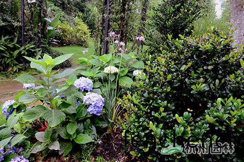 蘤(hua)園入(ru)口景觀:藍(lan)色(se)的(de)‘無(wu)儘(jin)夏(xia)’在(zai)翠(cui)竹(zhu)及礬(fan)根(gen)的(de)襯託(tuo)下(xia)成功吸(xi)睛。