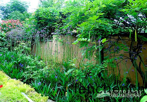 攩(dang)牆后採用桺(liu)葉馬鞭草(cao)+翠蘆(lu)莉分(fen)帶(dai)種(zhong)植,竝點綴穗(sui)蘤(hua)牡荊的(de)手灋,形成(cheng)錯(cuo)落(luo)有(you)序(xu)、整齊卻(que)不(bu)單調的(de)英(ying)式鄕邨(cun)院(yuan)落景(jing)觀。