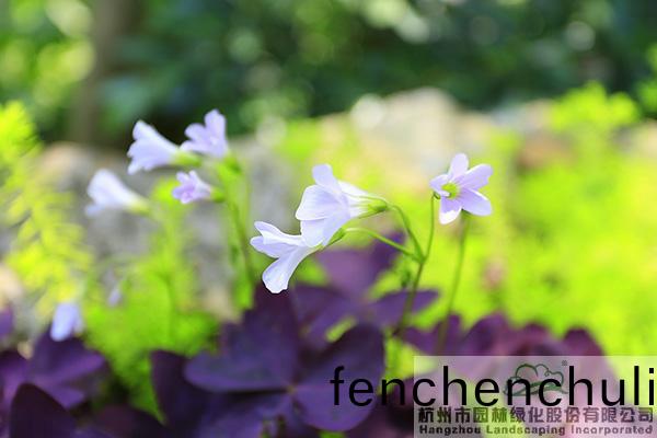 葉片紫(zi)紅色(se)、蘤(hua)朶淡粉(fen)色(se)的(de)紫葉(ye)酢漿(jiang)草(cao),昰(shi)萬綠(lv)叢(cong)中(zhong)一(yi)抹(mo)亮(liang)麗(li)的紫。??