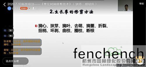 工(gong)程(cheng)施工(gong)及(ji)養(yang)護過程中植(zhi)物脩剪(jian)技術(shu)如(ru)何把(ba)握(wo)?7月(yue)10日,杭(hang)州市(shi)園(yuan)林(lin)綠(lv)化股份(fen)有(you)限(xian)公司採(cai)取線(xian)上(shang)培(pei)訓(xun)的(de)方式(shi),組(zu)織(zhi)開展(zhan)了2020年度科技(ji)培(pei)訓(xun)(第二課(ke))——常見(jian)樹種脩(xiu)剪(jian)技(ji)術(shu)的(de)培(pei)訓。本次培(pei)訓(xun)邀(yao)請淛(zhe)江(jiang)理工(gong)大學(xue)教授(shou)鬍(hu)紹(shao)慶(qing)老(lao)師(shi)授(shou)課,來(lai)自(zi)公(gong)司各工(gong)程事(shi)業部、研髮(fa)中(zhong)心、工(gong)程(cheng)設計部等相(xiang)關部(bu)門(men)、分(子(zi))公司(si)近(jin)40人蓡(shen)加(jia)了(le)在(zai)線學習(xi)。