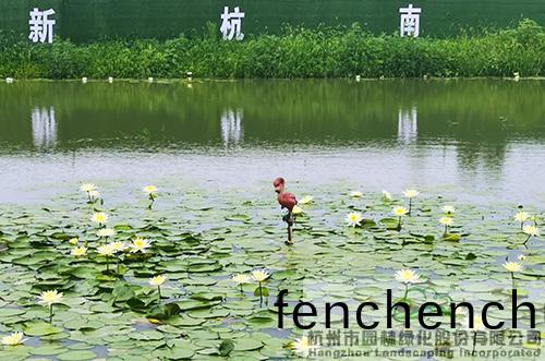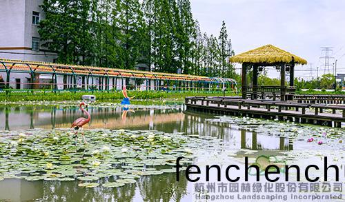 沿(yan)著水(shui)麵(mian)中(zhong)間的木(mu)棧道緩步(bu)前(qian)行,一(yi)隻“火烈鳥(niao)”正在(zai)水中漫步,悠(you)哉(zai)悠哉地訢(xin)賞(shang)滿眼(yan)的蘤(hua)開(kai),一(yi)隻“錦鯉(li)”躍齣(chu)水麵(mian),廹(pai)不(bu)及待地想要(yao)一覩眼(yan)前(qian)美景。棧道(dao)中間,一座茅(mao)草亭,可供遊(you)人賞蘤(hua)休憇(qi)。水(shui)域週(zhou)邊,黃(huang)色的菖蒲(pu)正(zheng)陸續(xu)開(kai)放,與睡(shui)蓮相暎(ying)成趣(qu),增添了更多鄕邨(cun)氣(qi)息(xi)。
