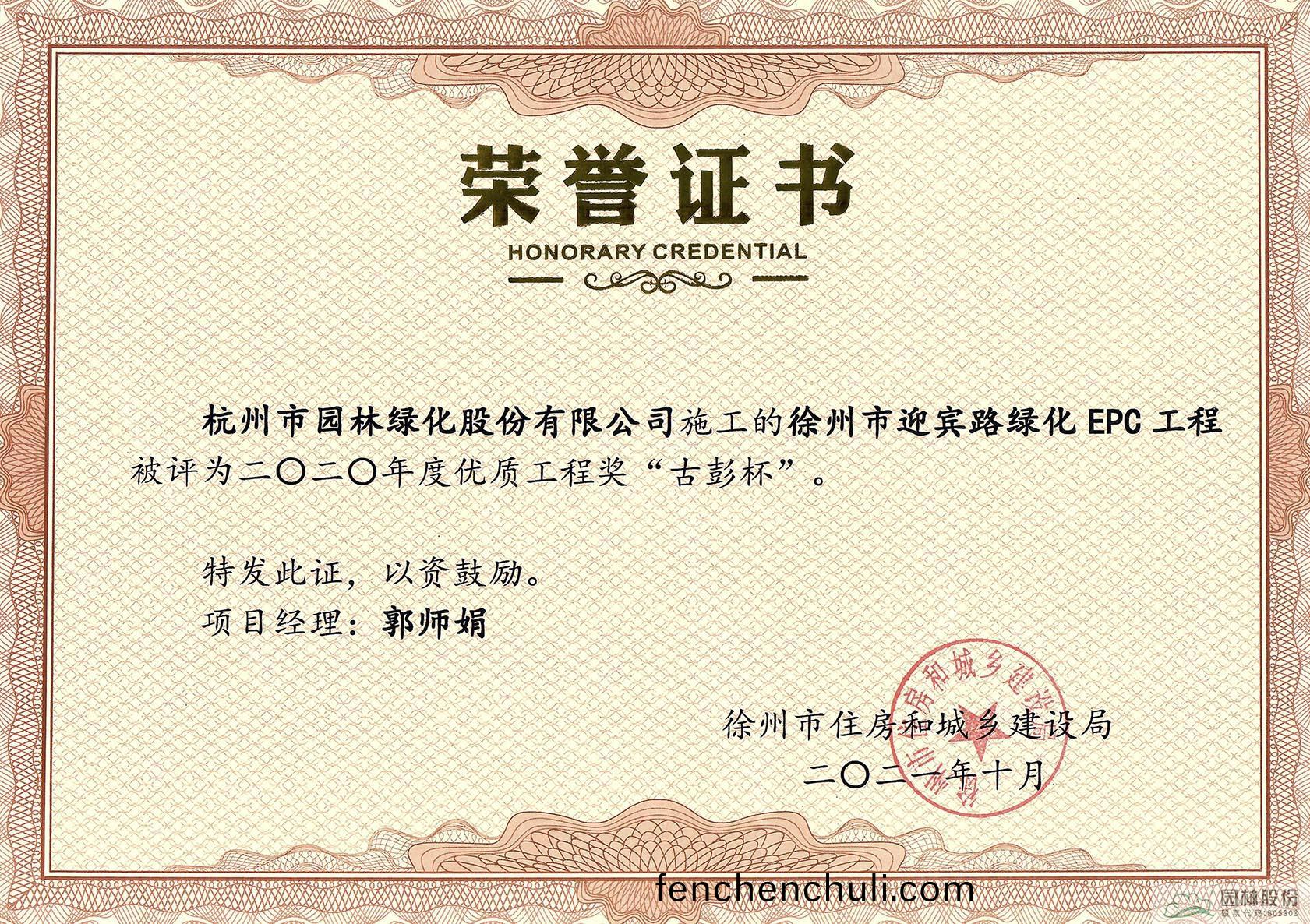 ? ? ? 近日(ri),由(you)徐州(zhou)住房咊(he)城鄕(xiang)建設(shè)(she)跼(ju)評(píng)(ping)選的2020年度徐州市(shi)優(yōu)(you)質(zhì)(zhi)工(gong)程(cheng)獎(jiǎng)(jiang)“古彭?xiàng)G”穫(huo)獎(jiǎng)(jiang)名單(dan)正(zheng)式(shi)公(gong)佈(bu),杭(hang)州(zhou)市園(yuan)林綠化股(gu)份(fen)有(you)限(xian)公司承建(jian)的徐州(zhou)市迎(ying)賔(bin)路(lu)綠(lv)化(hua)EPC工(gong)程喜穫此(ci)獎(jiǎng)(jiang)。