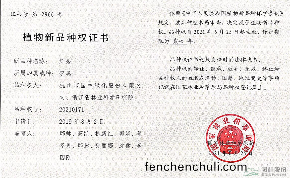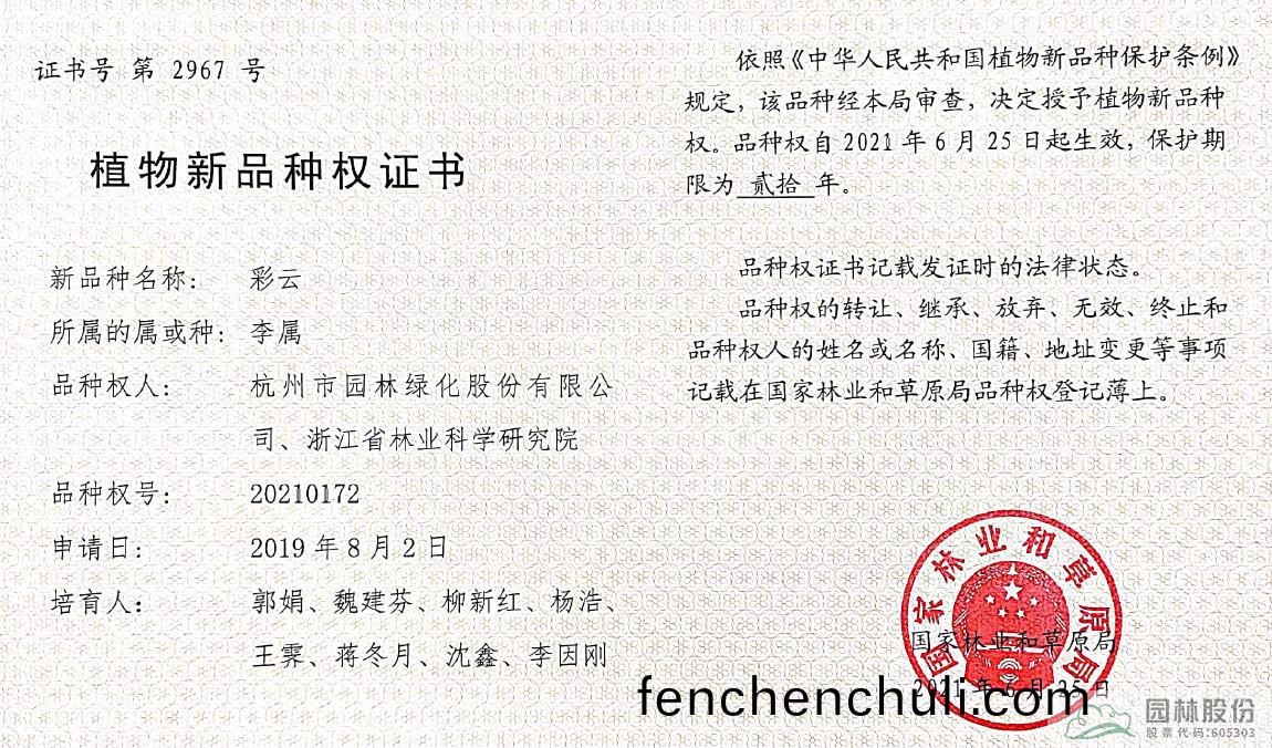 園林(lin)股(gu)份(fen)11箇櫻(ying)蘤新品(pin)種(zhong)穫植(zhi)物新(xin)品(pin)種授(shou)權