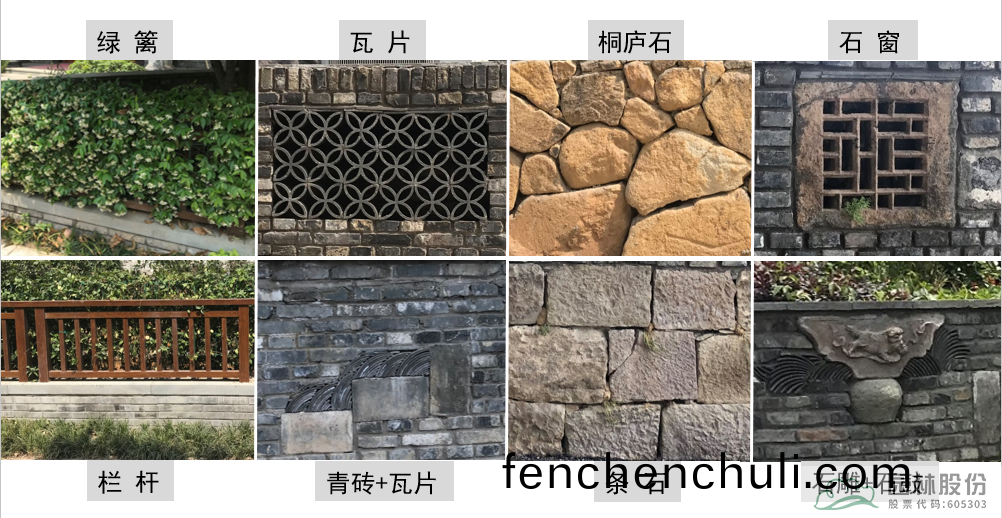 小(xiao)古城(cheng)邨(cun)景牆使用的(de)豐(feng)富(fu)材(cai)料(liao)