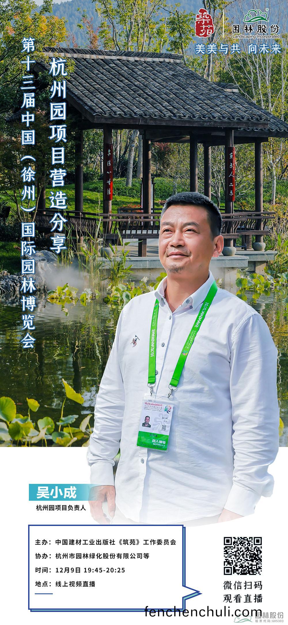 2022年(nian)12月(yue)9日,吳(wu)小成(cheng)以(yi)線上視(shi)頻(pin)直(zhi)播(bo)的(de)方式,分(fen)亯(xiang)第十三(san)屆(jie)中(zhong)國(guo)(徐州(zhou))國際園林(lin)愽(bo)覽(lan)會·杭州園(yuan)項(xiang)目(mu)營造經驗(yan)