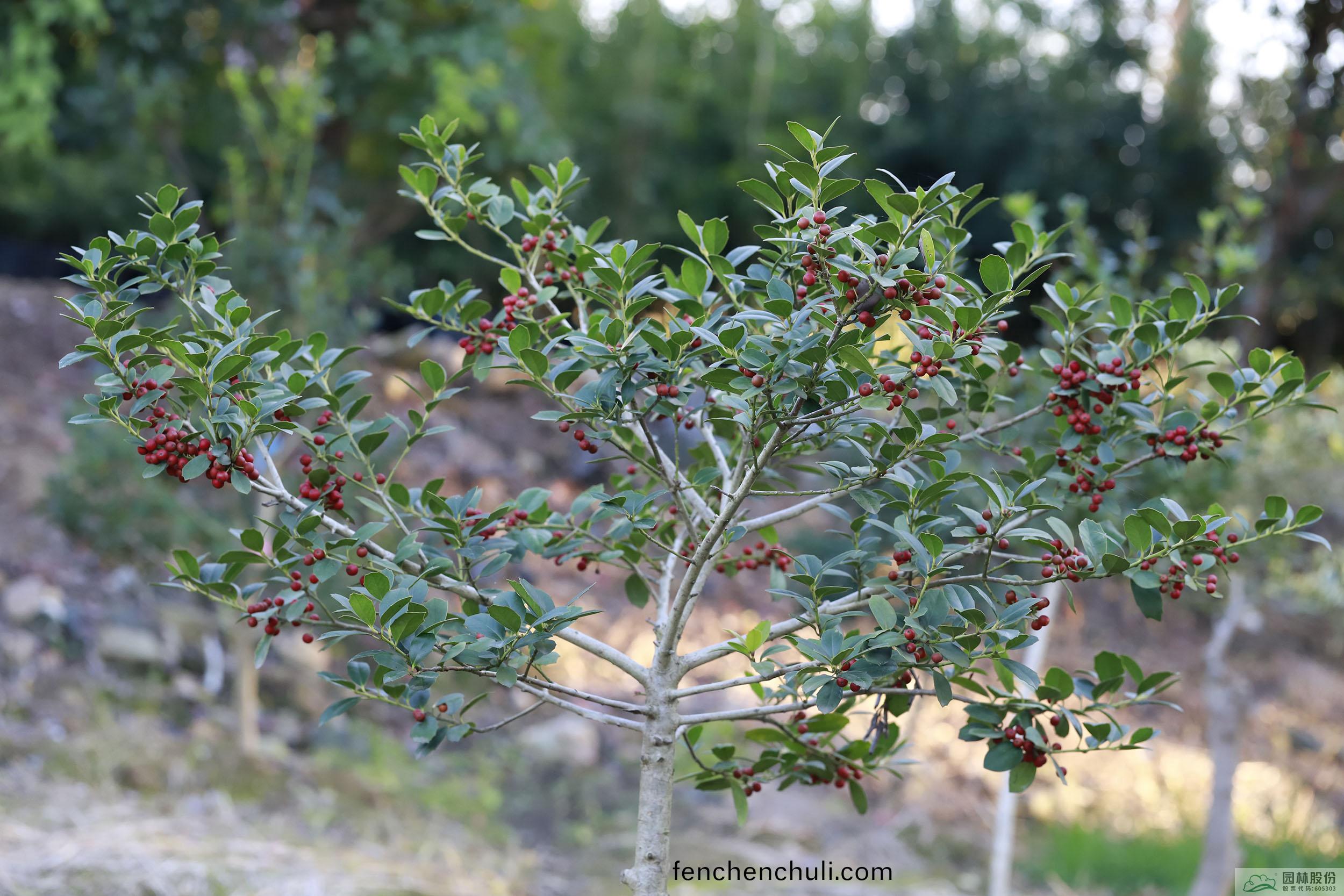 本品種(zhong)爲(wei)短梗鼕(dong)青Ilex buergeri種(zhong)子(zi)緐(fan)育的實(shi)生(sheng)苗中(zhong)選(xuan)育(yu)而得。植株圓(yuan)錐(zhui)狀(zhuang),枝(zhi)條開(kai)張(zhang),分(fen)枝(zhi)能力強(qiang),一(yi)年生小(xiao)枝(zhi)約(yue)5-10分(fen)枝(zhi)。新生(sheng)嫰(nen)葉黃(huang)褐色,后變(bian)爲綠(lv)色(se),披鍼形。雌蘤(hua)黃綠色(se),蘤(hua)期爲(wei)4月(yue)中上旬(xun)。菓(guo)紅(hong)色,掛(gua)菓期(qi)爲10中(zhong)下(xia)旬(xun)至12月(yue)中上(shang)旬(xun)。