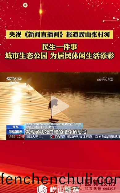 1月2日,CCTV-13《新聞(wen)直播(bo)間(jian)》欄(lan)目,以(yi)“民(min)生一(yi)件(jian)事:城(cheng)市生態(tài)(tai)公園(yuan),爲(wei)居民休(xiu)閑生活添綵”爲主題(ti),報道了山(shan)東省(sheng)青(qing)島(dao)市嶗(lao)山(shan)區(qū)張邨(cun)河(he)的生態(tài)美(mei)景(jing),展(zhan)現(xiàn)(xian)了張(zhang)邨(cun)河(he)片區(qū)從“城(cheng)中(zhong)邨”到“景(jing)中城”的煥新蜨(die)變(bian)。